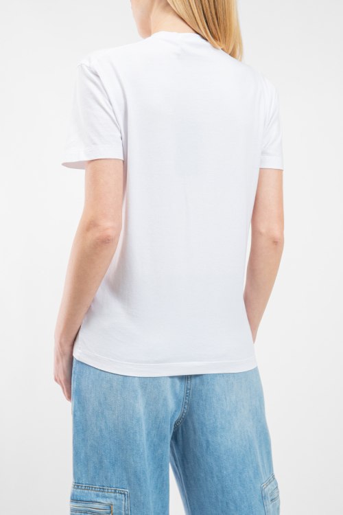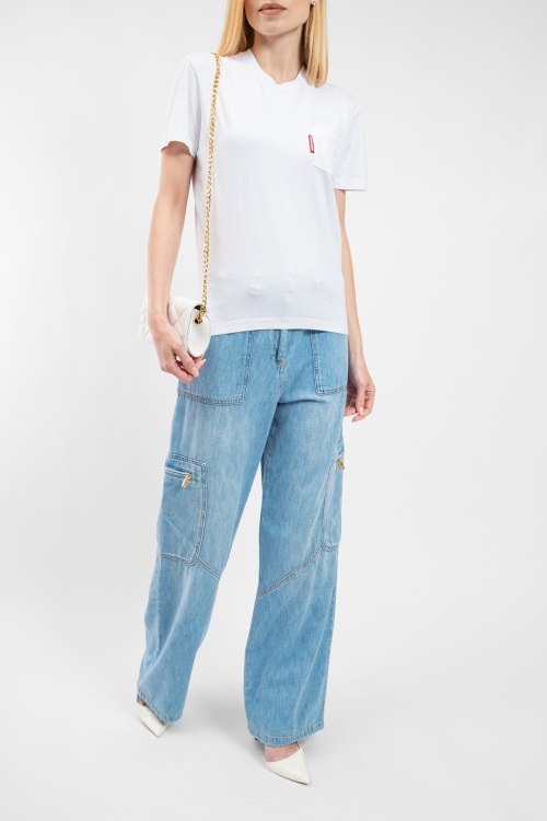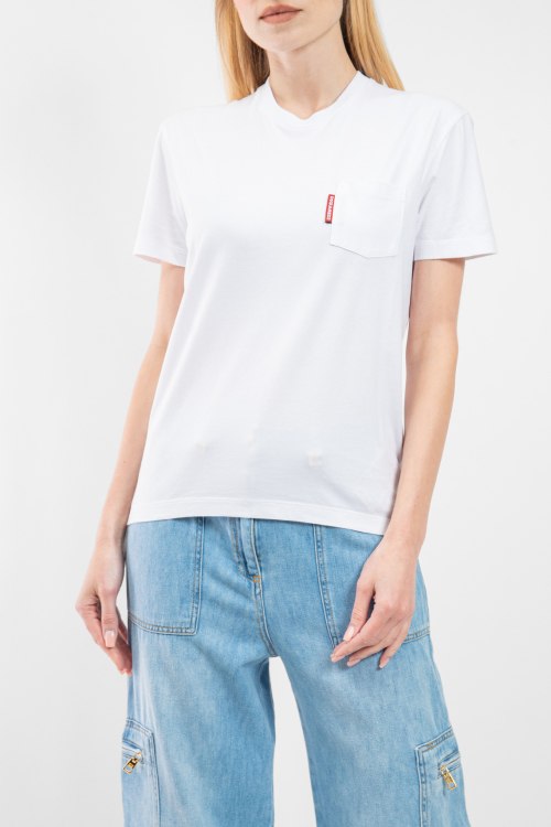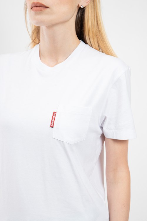 Женская белая хлопковая футболка от Dsquared2 (Дискваред). Накладной карман на груди, круглый вырез горловины, короткий рукав, классическая длина.