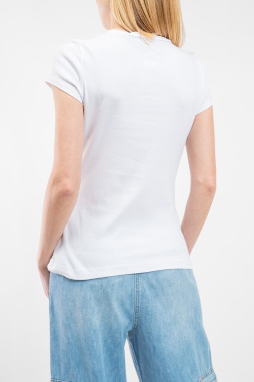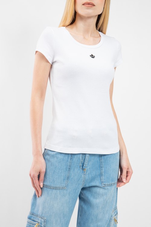 Женская белая хлопковая футболка от Dsquared2 (Дискваред). Логотип на груди, круглый вырез горловины, короткий рукав, классическая длина.