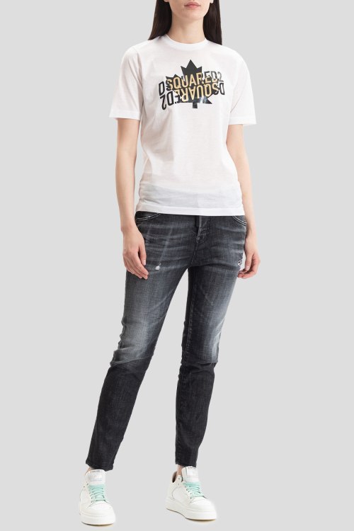 Детали: Женская белая футболка из хлопка от Dsquared2 (Дискваред). Классическая длина, круглый вырез горловины, короткие рукава, спереди принт с логотипом бренда