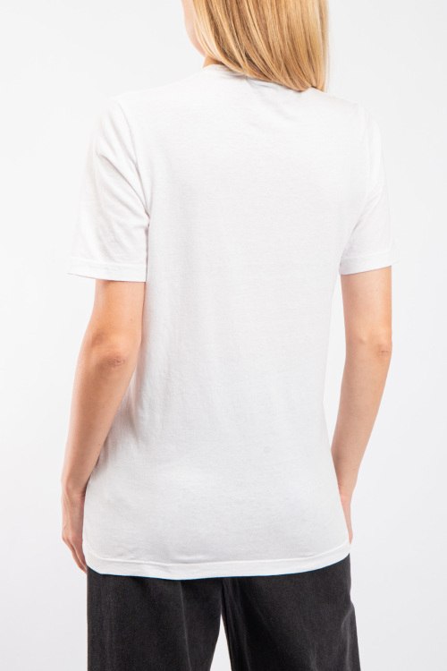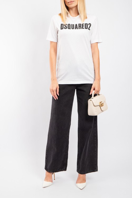 Женская белая хлопковая футболка от Dsquared2 (Дискваред). Логотип на груди, круглый вырез горловины, короткий рукав, удлиненная длина.