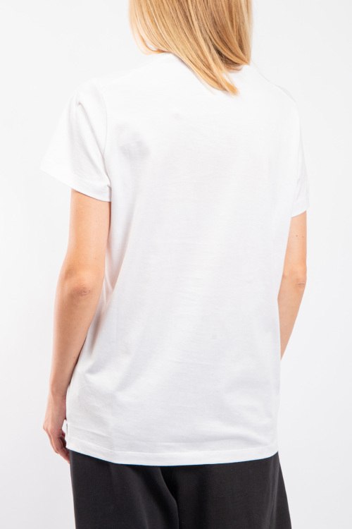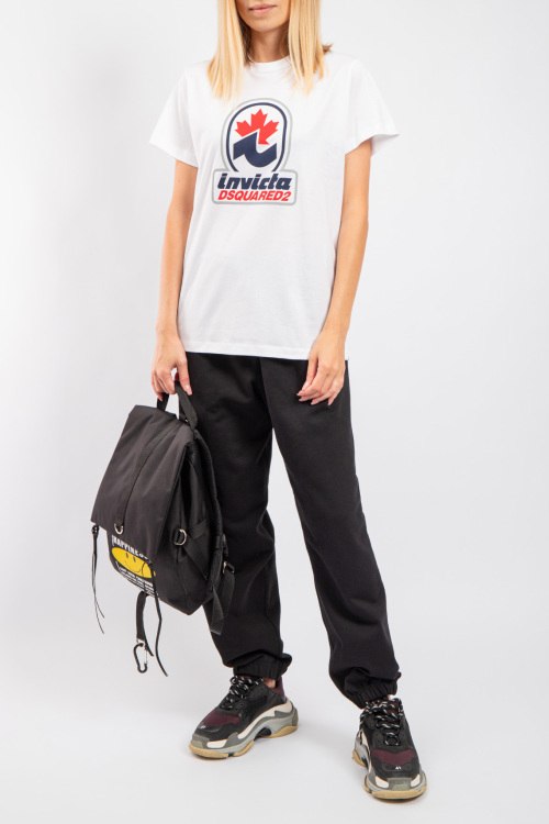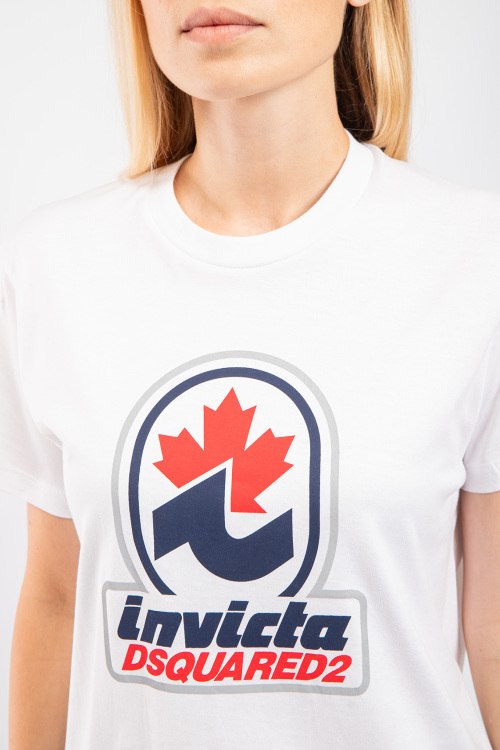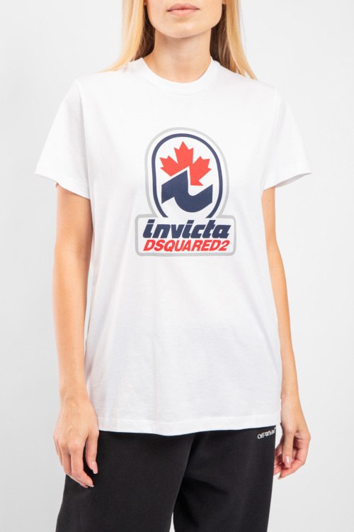 Женская белая хлопковая футболка D2 Invicta от Dsquared2 (Дискваред). Фасон oversize, логотип на груди, круглый вырез горловины, короткий рукав, удлиненная длина.