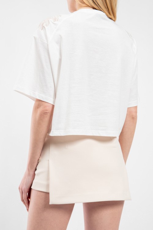 Женская белая хлопковая футболка от Elisabetta Franchi (Елизабетта Франчи). Ажурные вставки на плечах, круглый вырез горловины, короткий рукав, укороченная длина.