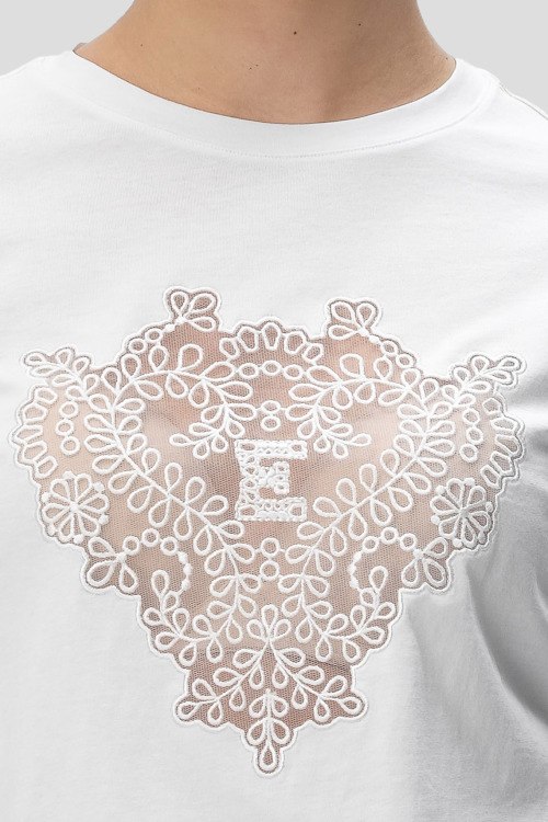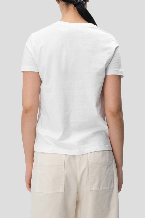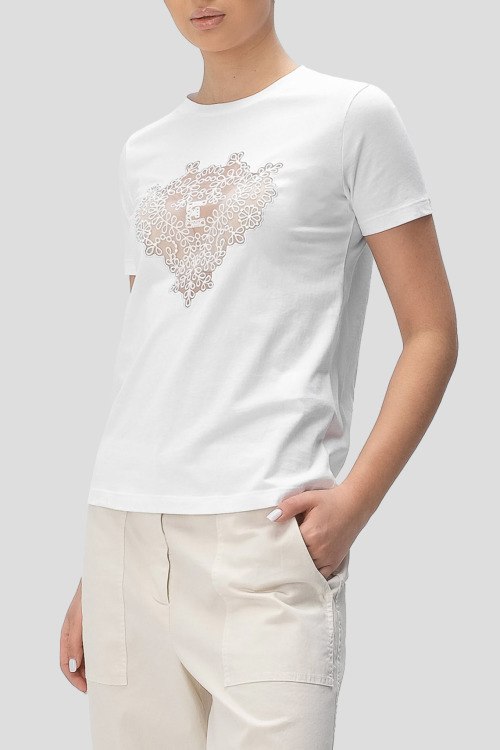 Детали: Женская белая футболка из хлопка от Ermanno Ermanno Scervino (Эрманно Эрманно Шервино). Классическая длина, круглый вырез горловины, короткие рукава, модель декорирована принтом