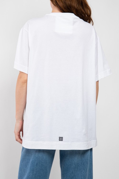 Женская белая хлопковая футболка от Givenchy (Живанши). Фасон oversize, удлиненная. Контрастный принт с логотипом на груди, круглый вырез горловины, короткий рукав. На модели снят размер - M. Параметры модели: 175 см, 83-64-87