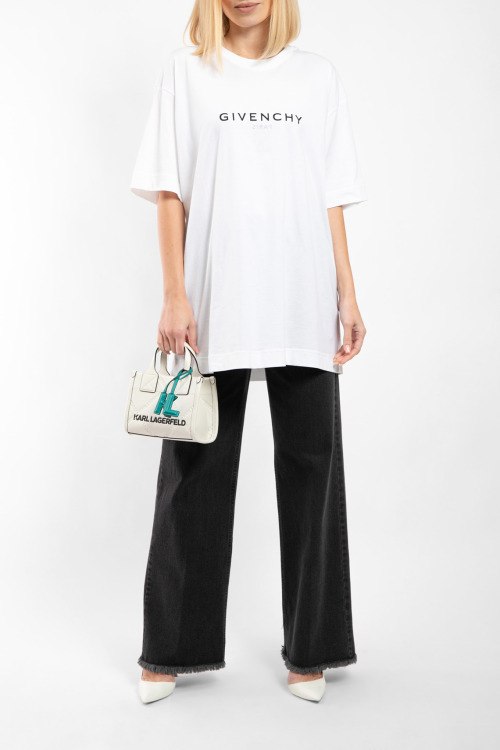 Женская белая хлопковая футболка от Givenchy (Живанши). Фасон oversize, принт с логотипом на груди, круглый вырез горловины, короткий рукав, удлиненная длина.