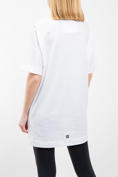 Женская белая хлопковая футболка от Givenchy (Живанши). Накладной карман с вышитым логотипом на груди, фасон oversize, круглый вырез горловины, короткий рукав, удлиненная длина.