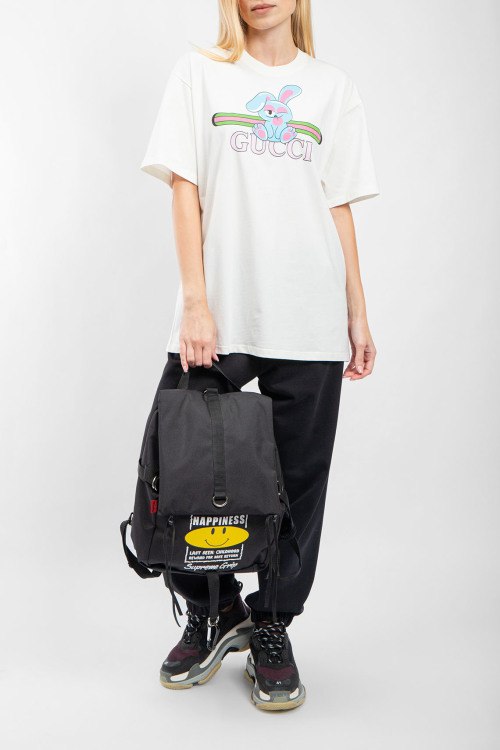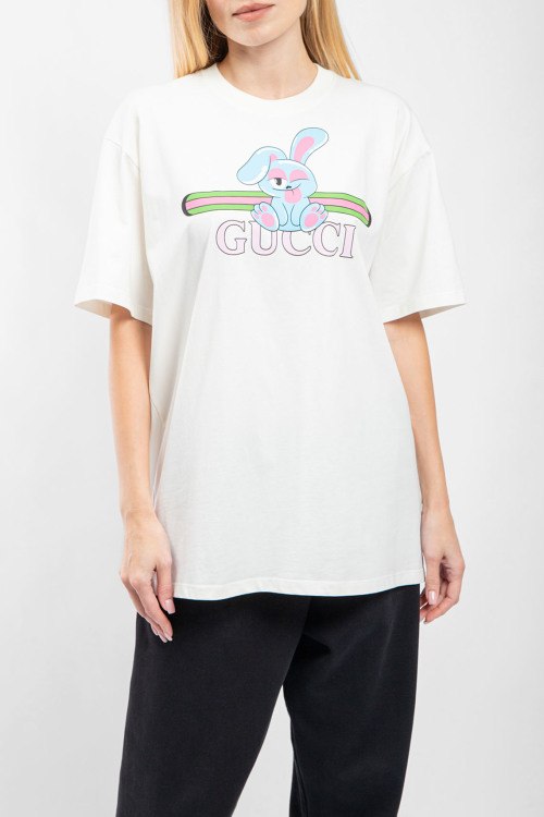 Детали: Женская белая хлопковая футболка от Gucci (Гуччи). Фасон oversize, логотип на груди, круглый вырез горловины, короткий рукав, удлиненная длина
