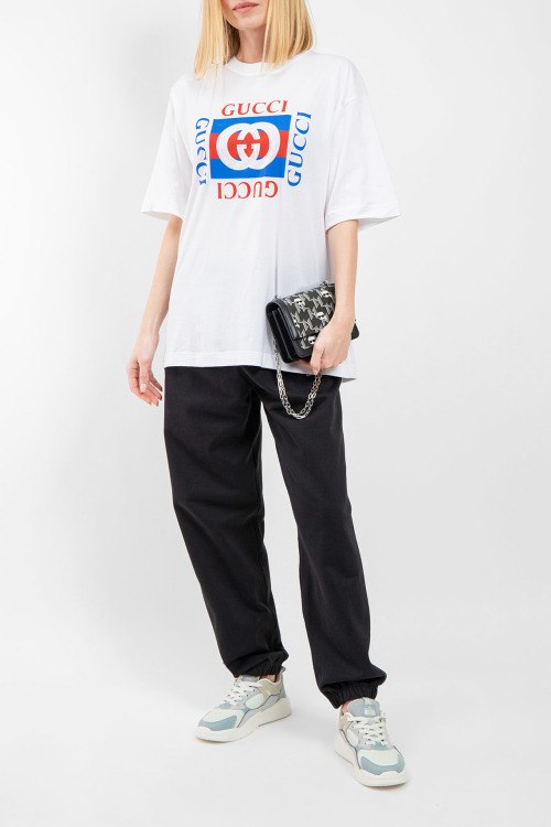 Женская белая хлопковая футболка от Gucci (Гуччи). Принт с логотипом на груди, фасон oversize, круглый вырез горловины, короткий рукав, удлиненная длина.