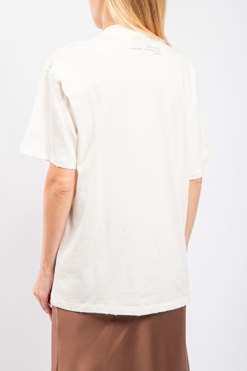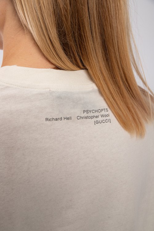 Женская белая футболка из хлопка от Gucci (Гуччи). Спереди на груди принт, круглый вырез горловины, короткие рукава.