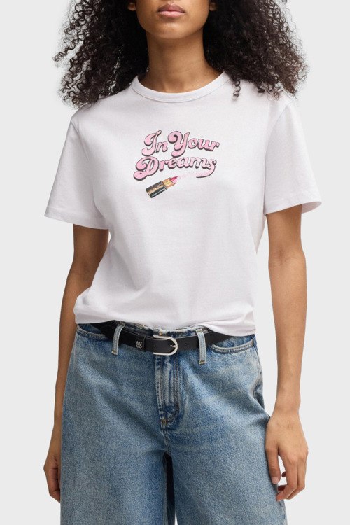 Детали: Женская белая хлопковая футболка Damacia от Hugo by Hugo Boss (Хуго бай Хуго Босс). Принт на груди, круглый вырез горловины, короткий рукав, классическая длина