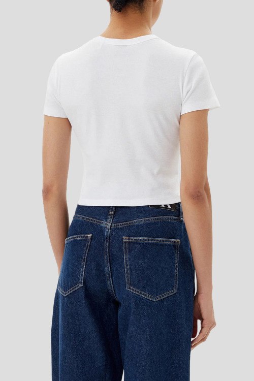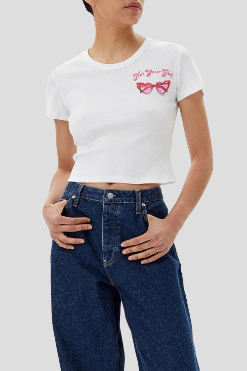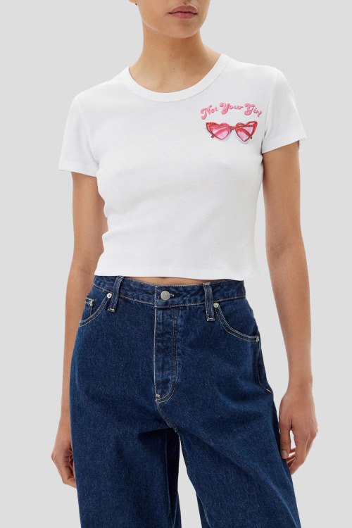 Детали: Женская белая футболка Delanor из хлопка от Hugo by Hugo Boss (Хуго бай Хуго Босс). Укороченная длина, круглый вырез горловины, короткие рукава, графический принт на груди