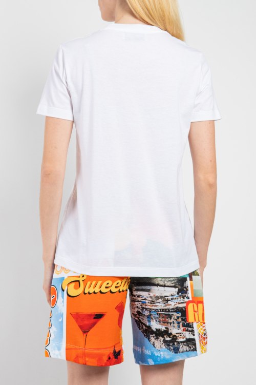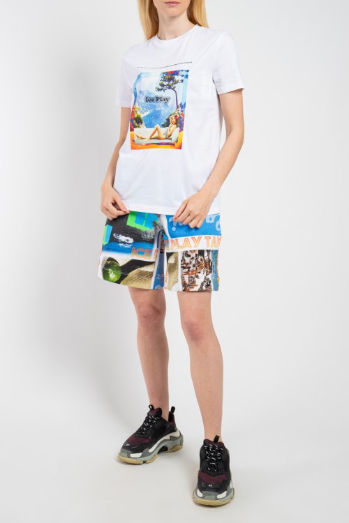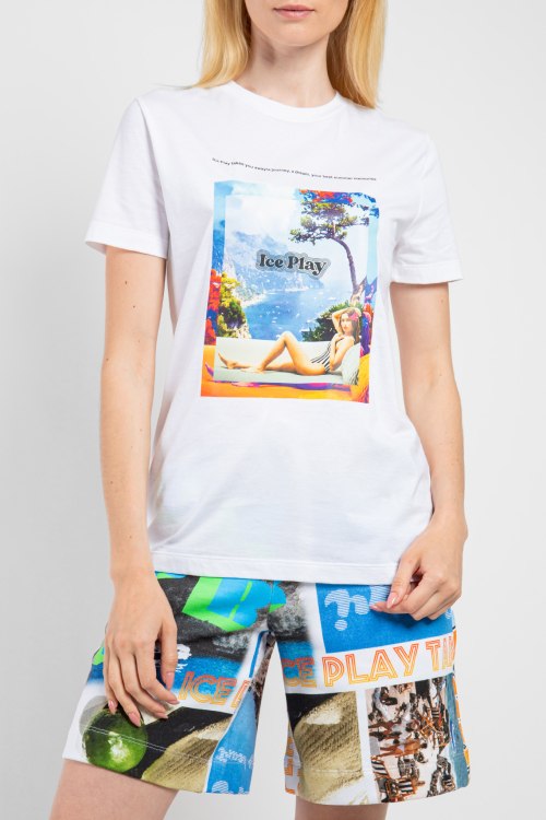 Женская белая футболка из хлопка от Ice Play (Айс Плей). Классическая длина, круглый вырез горловины, короткие рукава, на груди принт с логотипом бренда