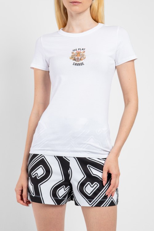 Женская черная футболка из хлопка от Ice Play (Айс Плей). Классическая длина, круглый вырез горловины, короткие рукава, принт с тигром