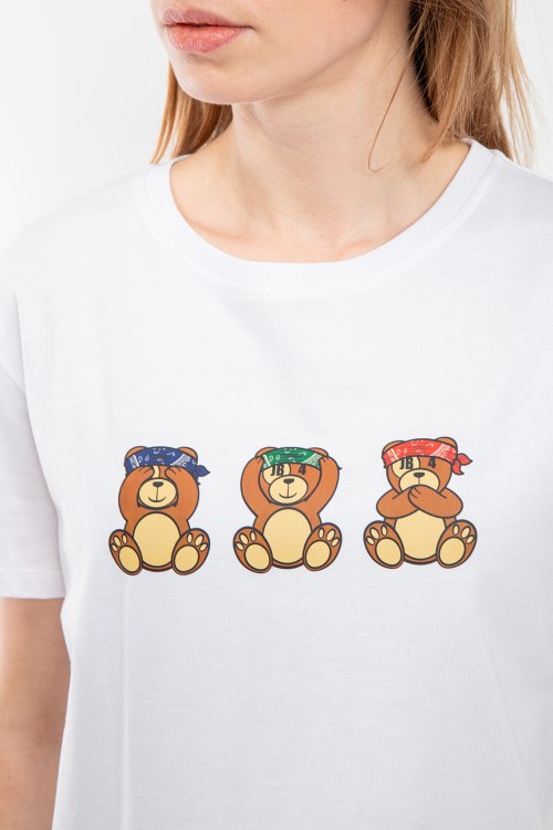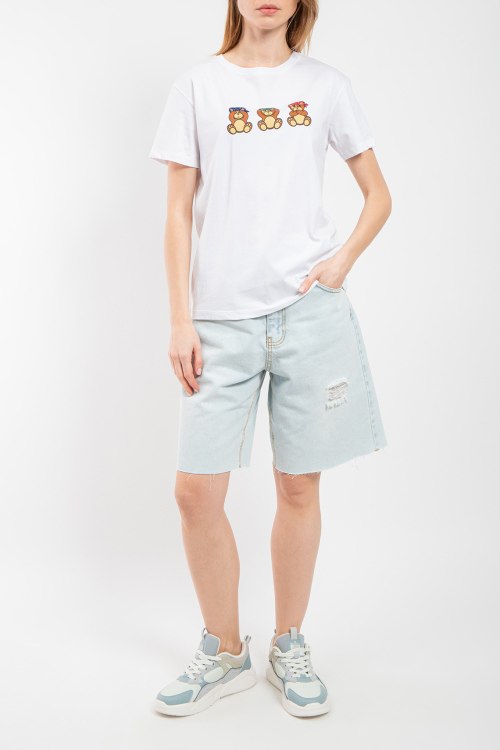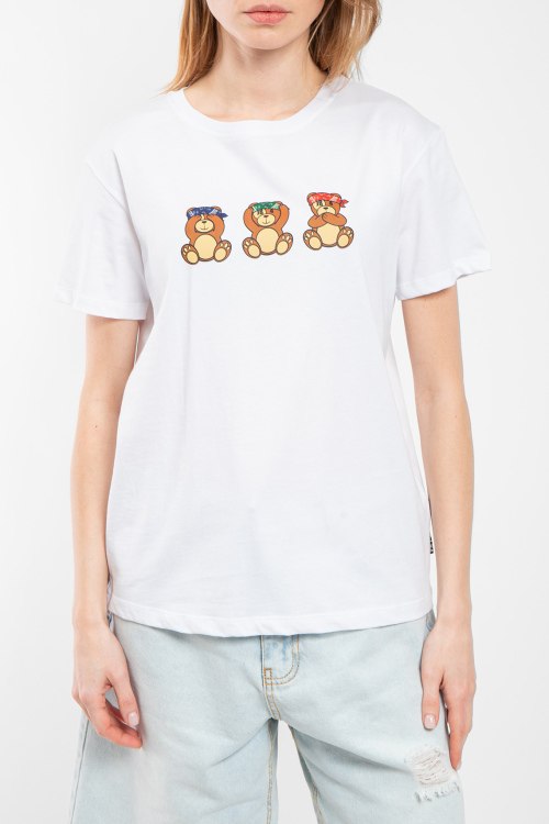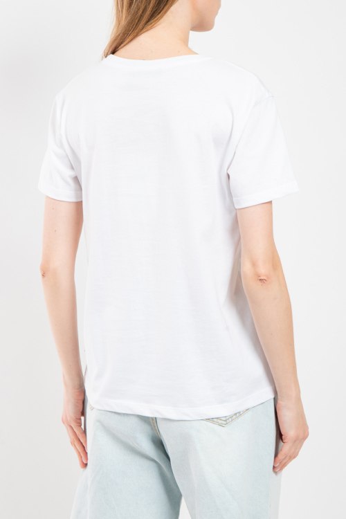 Женская белая футболка из хлопка от J.B4 Just Before (Джаст Бифо). Классическая длина, круглый вырез горловины, короткие рукава, декорирована принтом с логотипом.