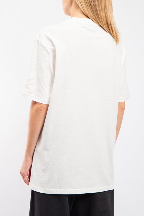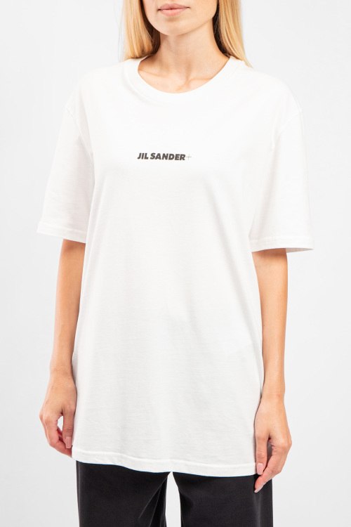 Женская белая хлопковая футболка от Jil Sander (Джил Сандер). Фасон oversize, логотип на груди, круглый вырез горловины, короткий рукав, удлиненная длина.