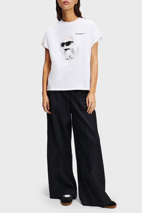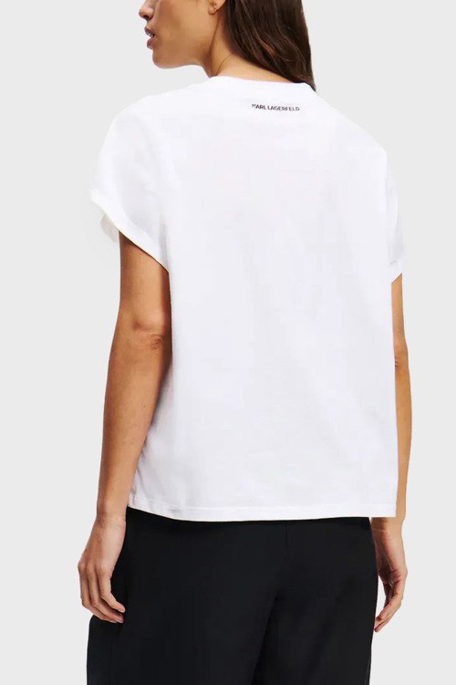 Детали: Женская белая хлопковая футболка Ikon Aquarelle от Karl Lagerfeld (Карл Лагерфельд). Принт на груди, круглый вырез горловины, короткий рукав, классическая длина