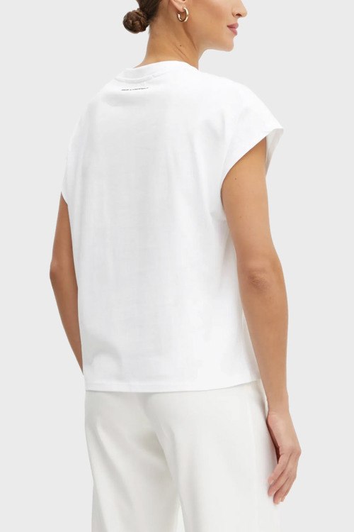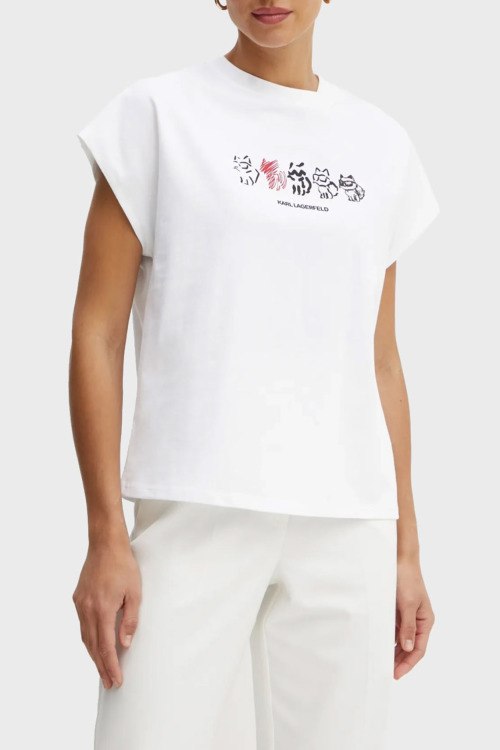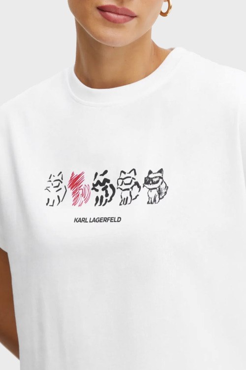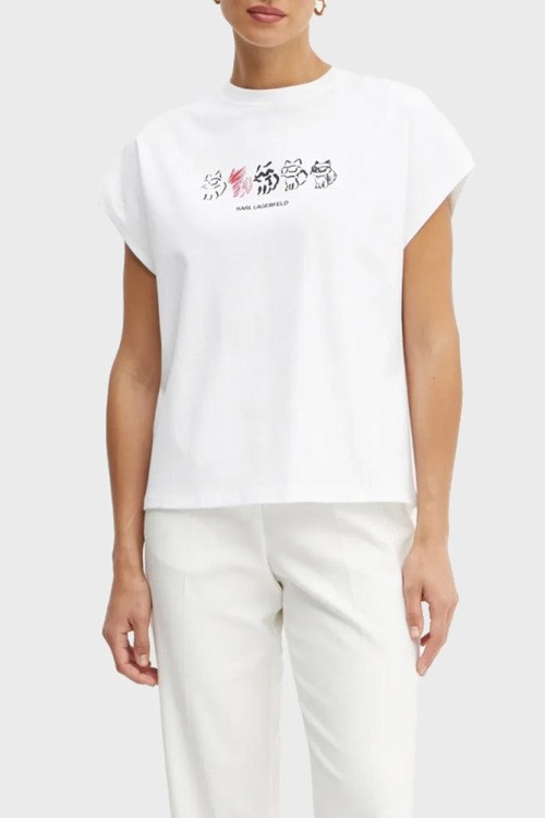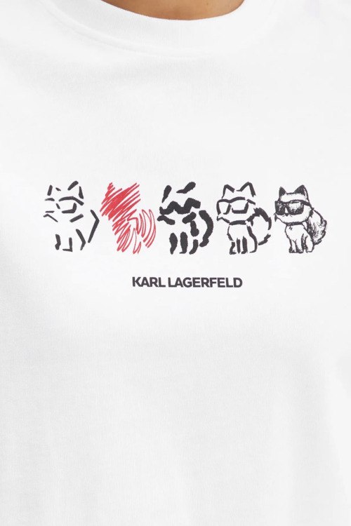 Детали: Женская белая футболка из хлопка от Karl Lagerfeld (Карл Лагерфельд). Классическая длина, круглый вырез горловины, короткие рукава, графический принт Ikon Seasonal Logo на груди