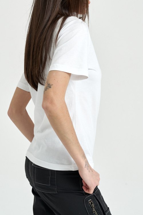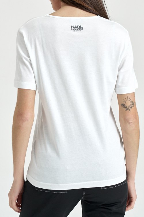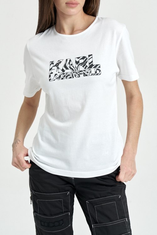 Женская белая футболка из хлопка от Karl Lagerfeld (Карл Лагерфельд). Классическая длина, кргулый вырез горловины, короткие рукава, животноводческий принт Ikonik Karl на груди