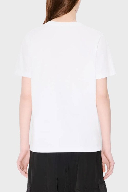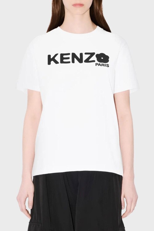 Детали: Женская белая футболка из хлопка от Kenzo (Кензо). Круглый вырез горловины, короткие рукава, вышитый логотип бренда на груди