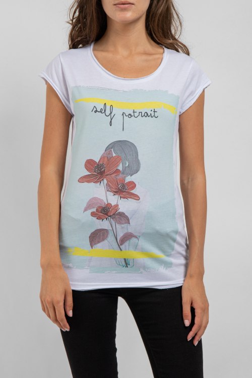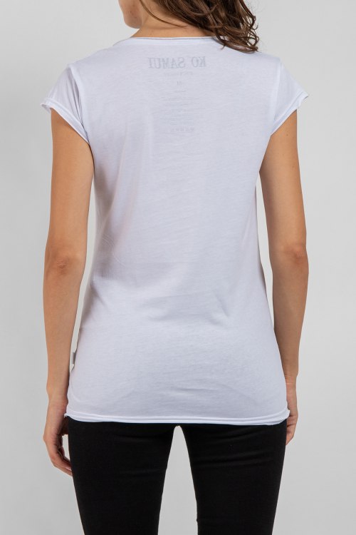 Женская белая хлопковая футболка от Ko Samui (Ко Самуи). Принт спереди, круглый вырез горловины, короткий рукав, классическая длина.