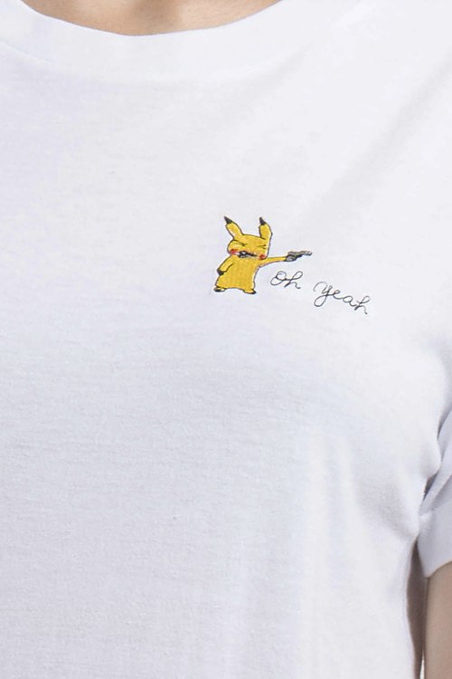 Женская белая футболка из хлопка от Ko Samui (Ко Самуи). Спереди вышивка Pikachu на груди, круглый вырез горловины, короткие рукава, ровный низ изделия.