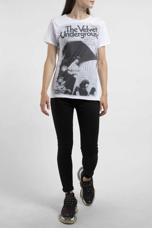 Женская белая футболка из хлопка от Ko Samui (Ко Самуи). Спереди принт The Velvet Underground, круглый вырез горловины, короткие рукава, ровный низ изделия.