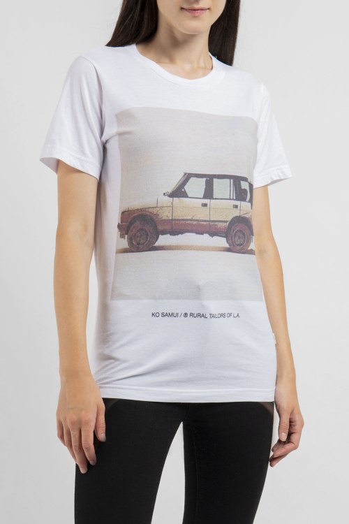 Женская белая футболка из хлопка от Ko Samui (Ко Самуи). Спереди принт Jeep, круглый вырез горловины, короткие рукава, ровный низ изделия.
