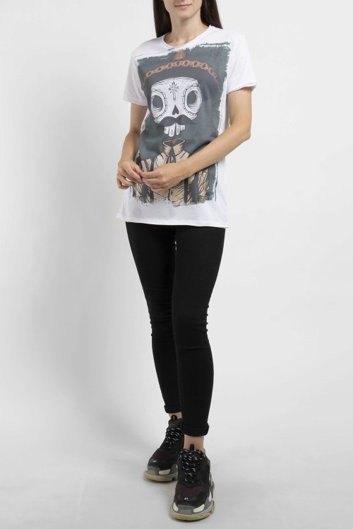 Женская белая футболка из хлопка от Ko Samui (Ко Самуи). Круглый вырез горловины, короткие рукава, спереди принт Sombrero.