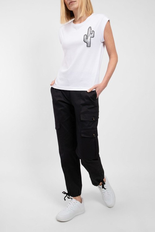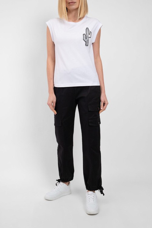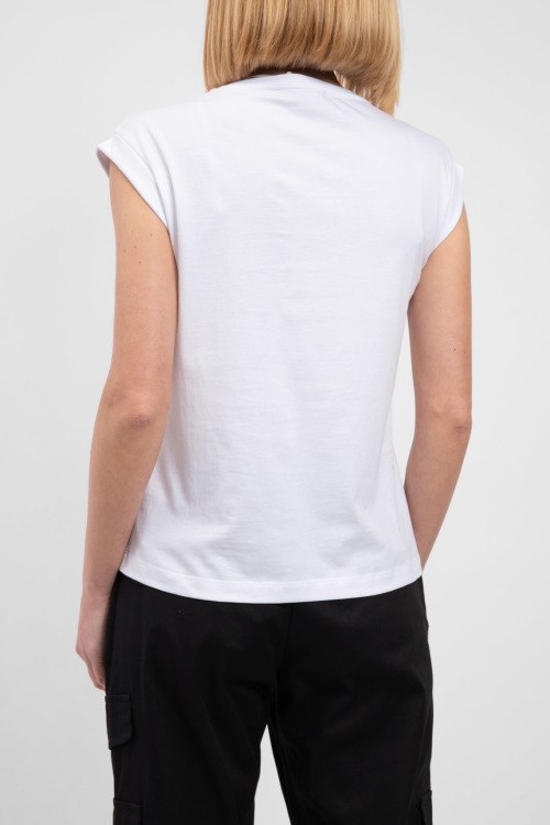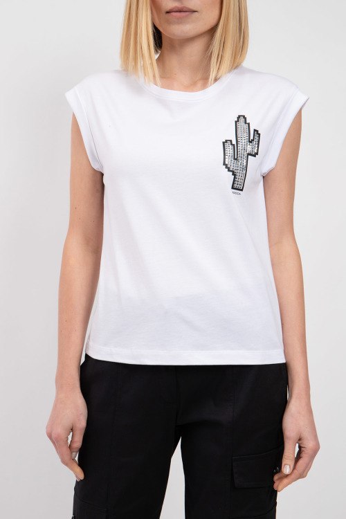 Женская белая футболка из хлопка от Kocca (Кокка). Классическая длина, круглый вырез горловины, модель без рукавов, дизайн с заклепками на груди.