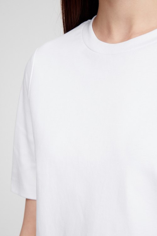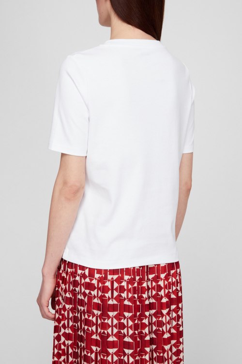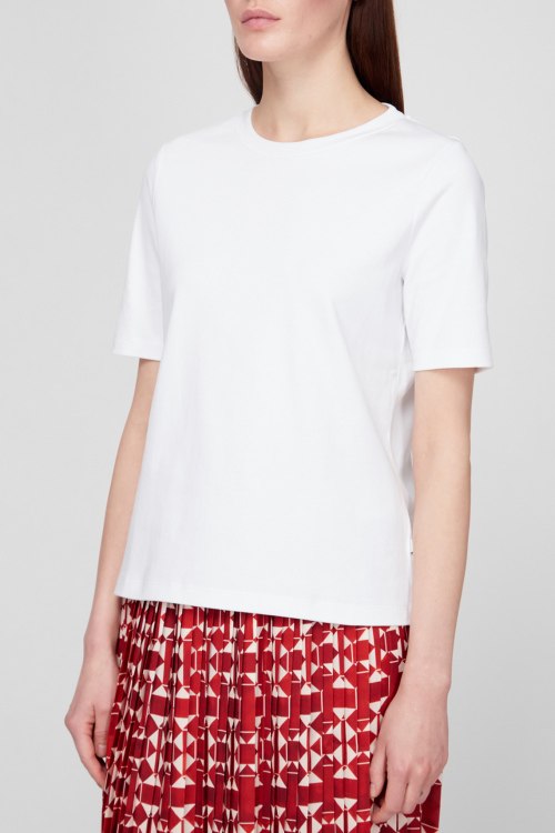 Детали: Женская белая футболка из хлопка от Maerz (Маерз). Круглый вырез горловины, короткие рукава, классическая длина. Измерения: длина рукава: короткий, 25 см, обхват груди: 96 см, обхват талии: 94 см, длина изделия по среднему шву спинки от горловины: 58 см. Размер на модели: 36. Рост модели: 178 см