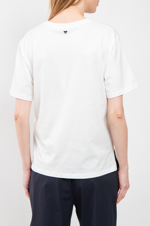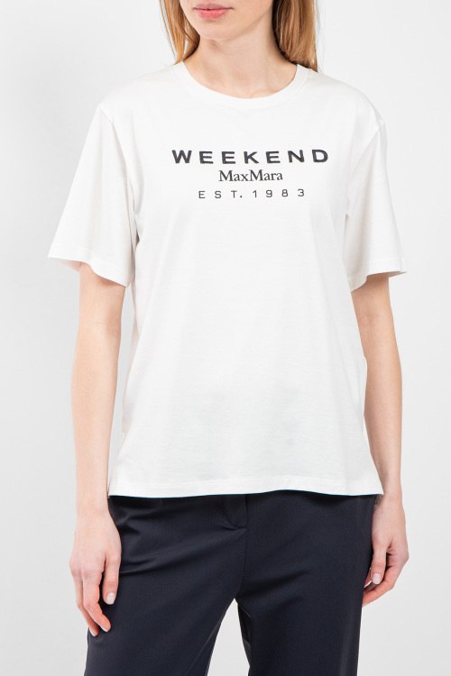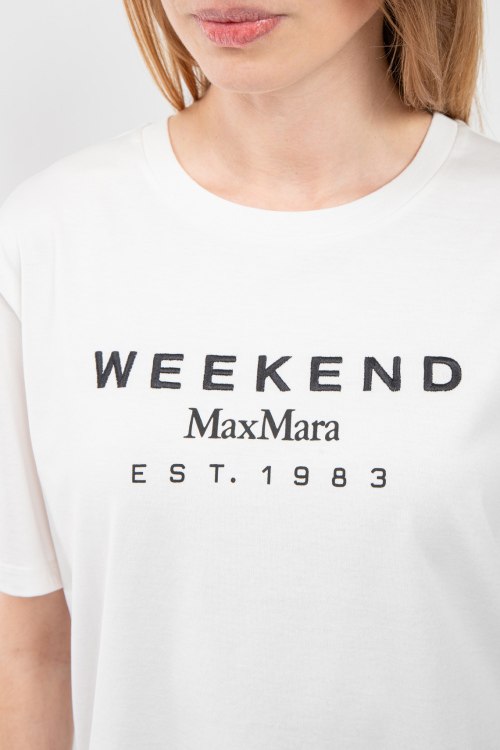Женская белая футболка из хлопка от Max Mara Weekend (Макс Мара Викенд). Классическая длина, круглый вырез горловины, короткие рукава, вышитый логотип бренда на груди.