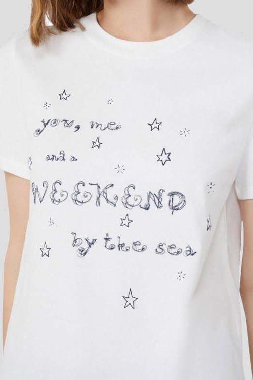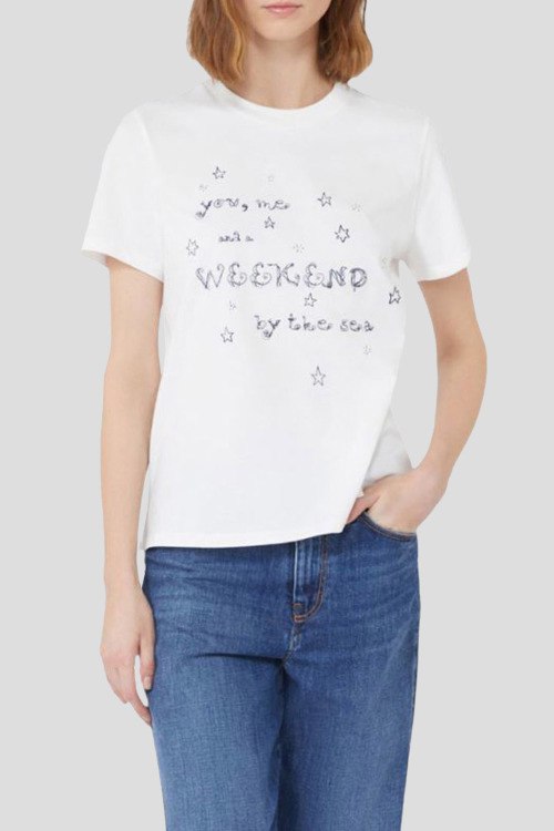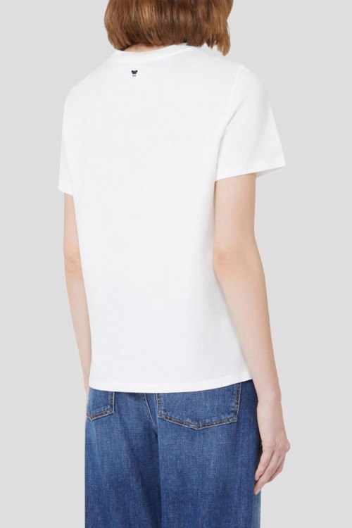Детали: Женская белая хлопковая футболка Ara от Max Mara Weekend (Макс Мара Викенд). Принт на груди, круглый вырез горловины, короткий рукав, классическая длина