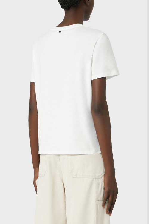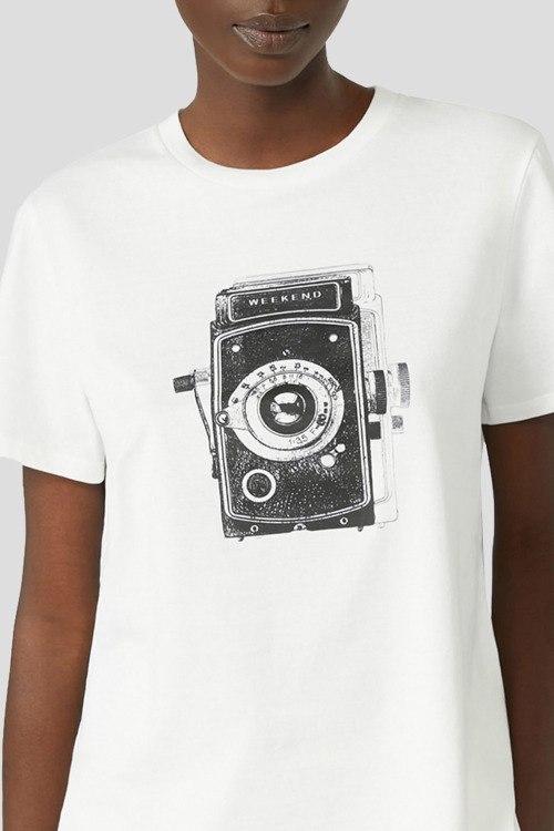 Детали: Женская белая хлопковая футболка Guglia от Max Mara Weekend (Макс Мара Викенд). Принт на груди, круглый вырез горловины, короткий рукав, классическая длина