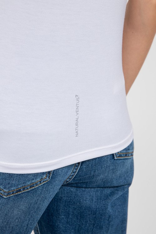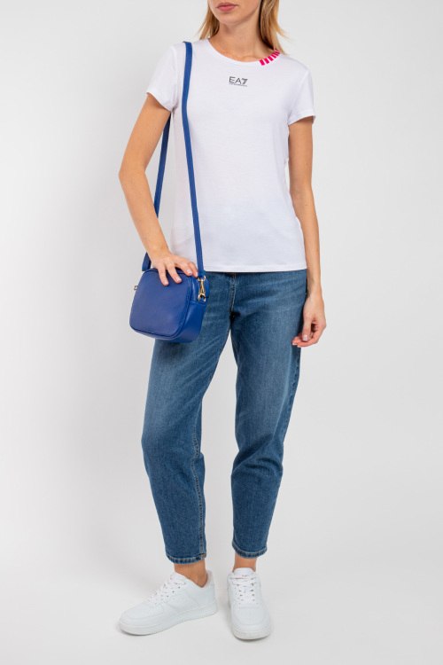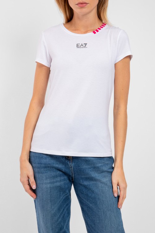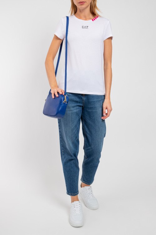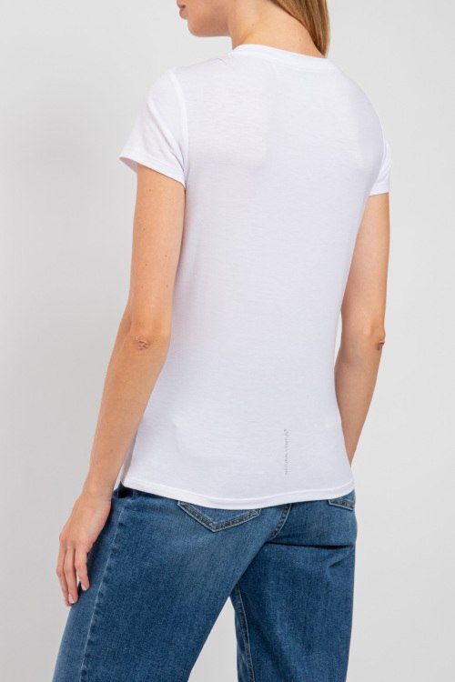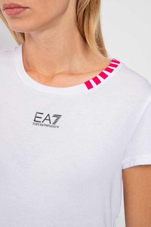 Женская белая футболка из полиэстера и вискозы от EA7 Emporio Armani (ЕА7 Эмпорио Армани). Классическая длина, круглый вырез горловины, короткие рукава, принт с логотипом бренда на груди.