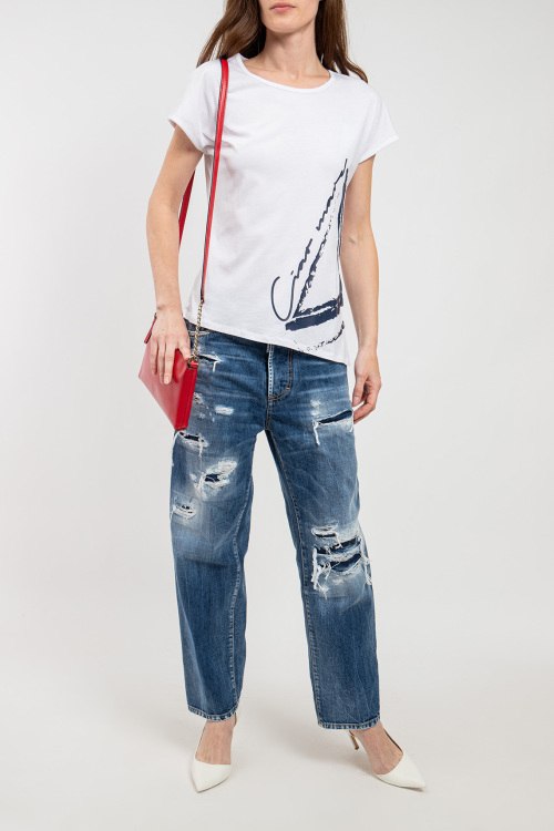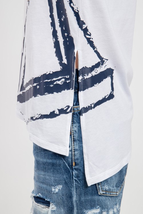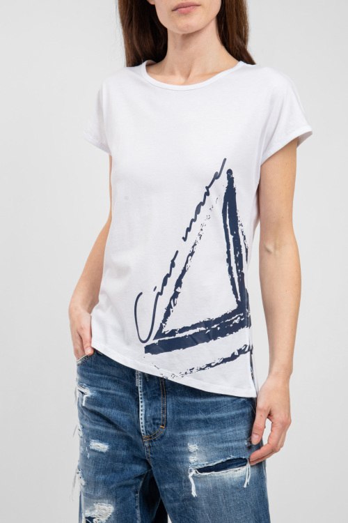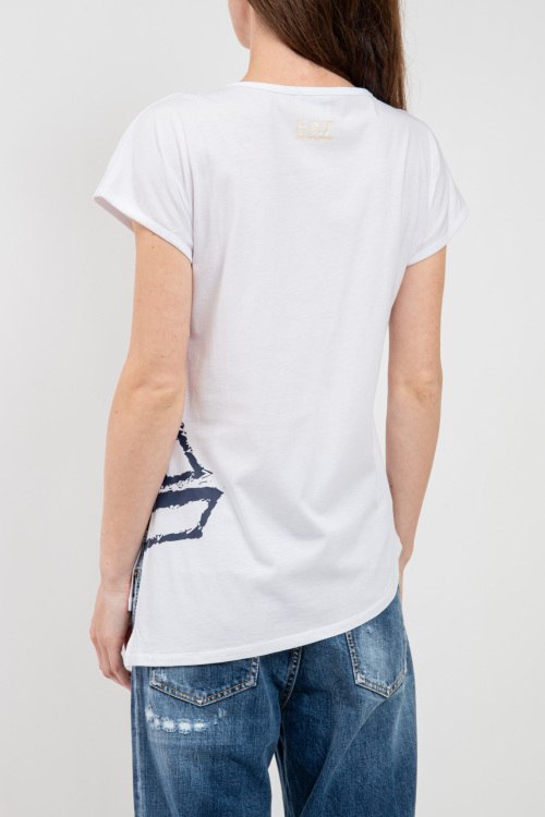 Женская белая футболка из хлопка и модала от Armani (Армани). Асимметричный низ изделия, круглый вырез горловины, короткие рукава, сбоку разрез, яркий принт сбоку.