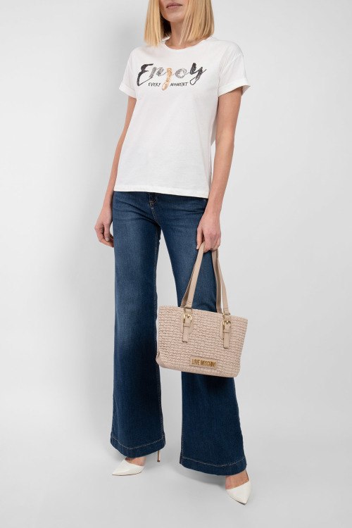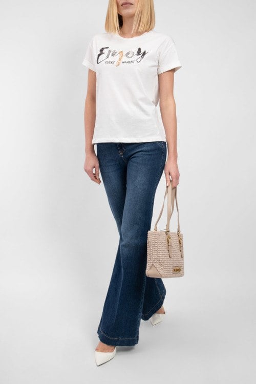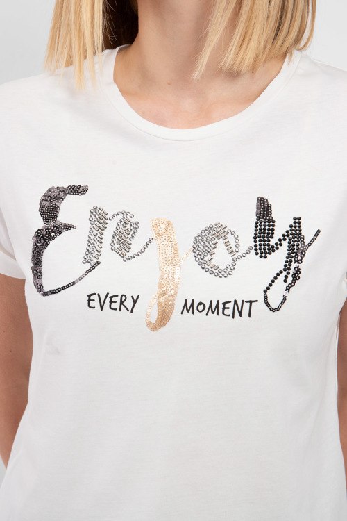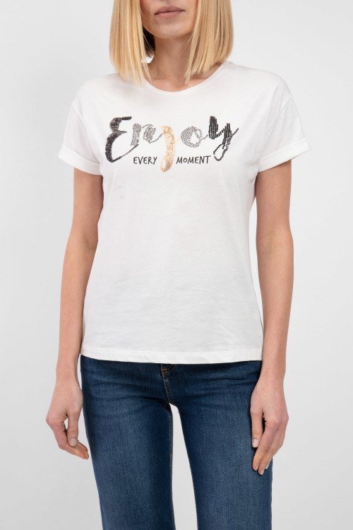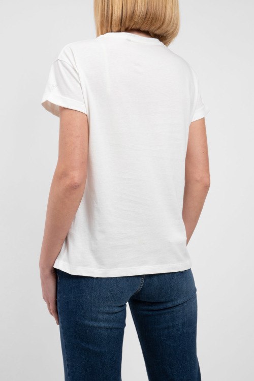 Женская белая футболка из хлопка от Fred Mello (Фред Мелло). Классическая длина, круглый вырез горловины, короткие рукава, аппликация из кристаллов и бисера.