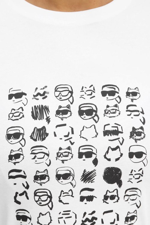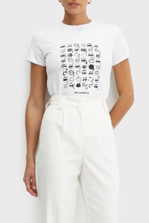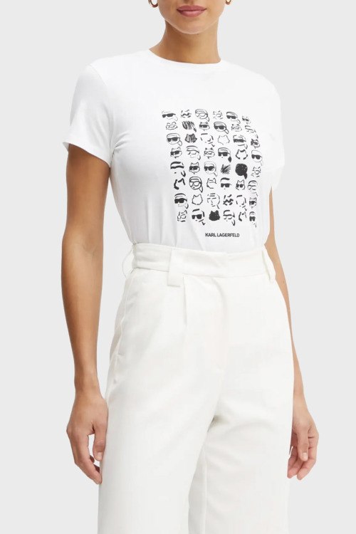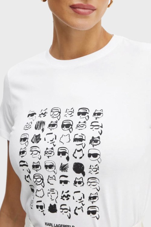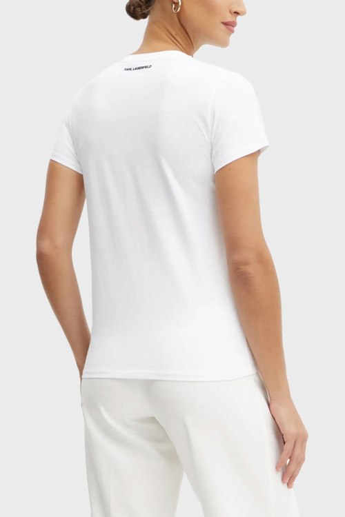 Детали: Женская белая футболка Ikon Seasonal Logo из хлопка от Karl Lagerfeld (Карл Лагерфельд). Классическая длина, круглый вырез горловины, короткие рукава, брендированный принт