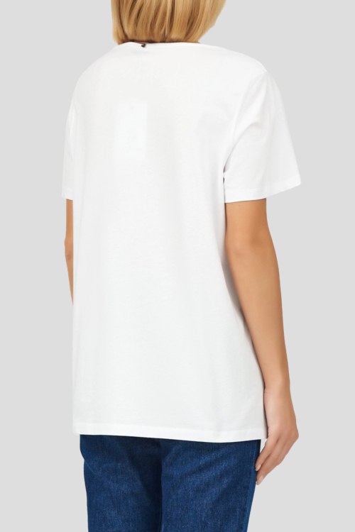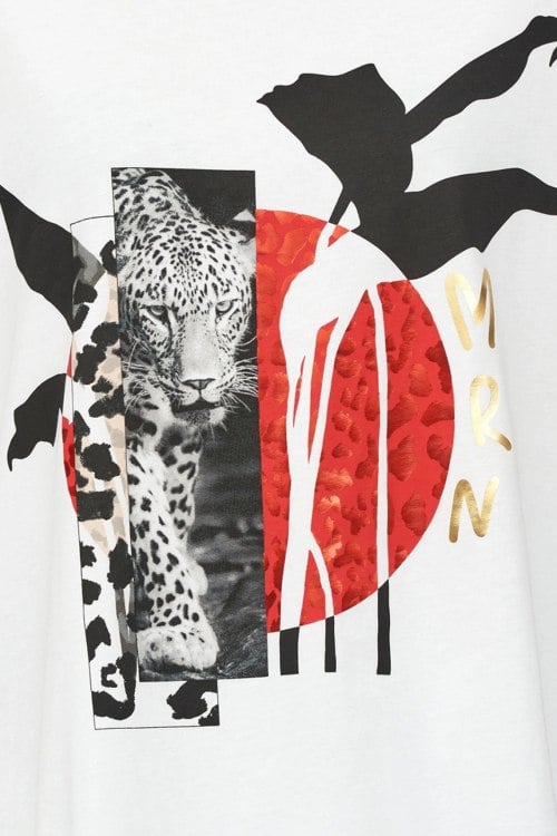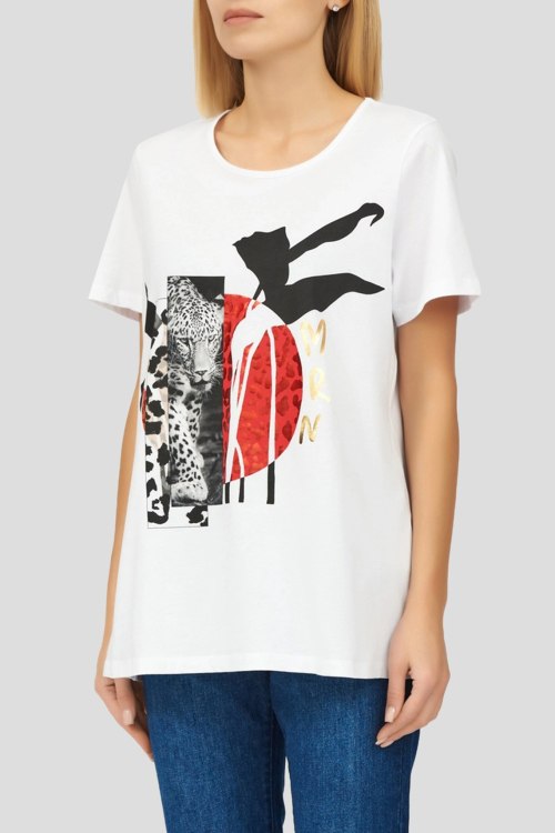 Детали: Женская белая футболка из хлопка от Marina Rinaldi (Марина Ринальди). Круглый вырез горловины, короткие рукава, модель декорирована ярким принтом спереди