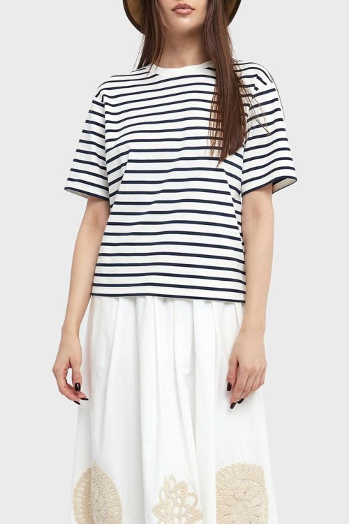 Детали: Женская белая футболка MultiD из хлопка от Max Mara Weekend (Макс Мара Викенд). Удлиненная длина по спинке, круглый вырез горловины, короткие рукава, дизайн в полоску черного цвета