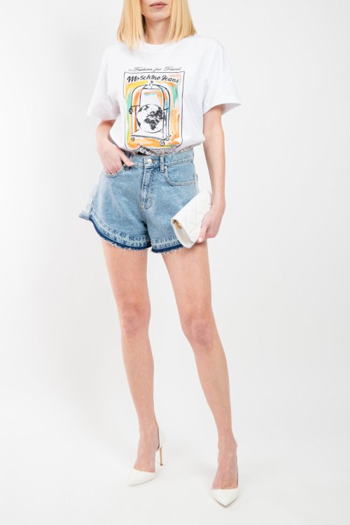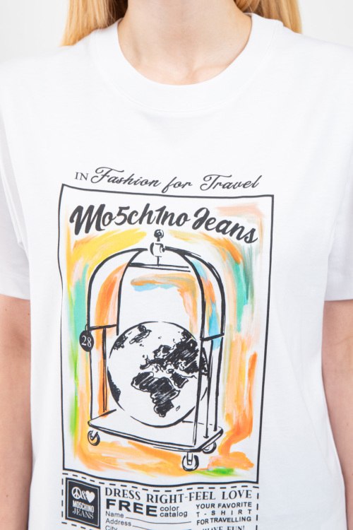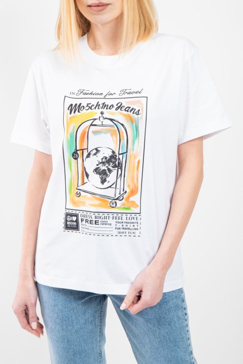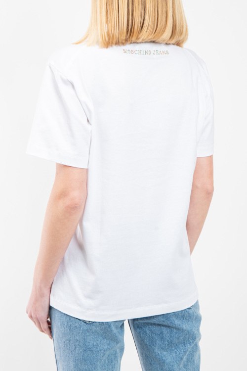 Женская белая футболка из хлопка от Moschino (Москино). Классическая длина, круглый вырез горловины, короткие рукава, модель декорирована принтом с логотипом бренда.