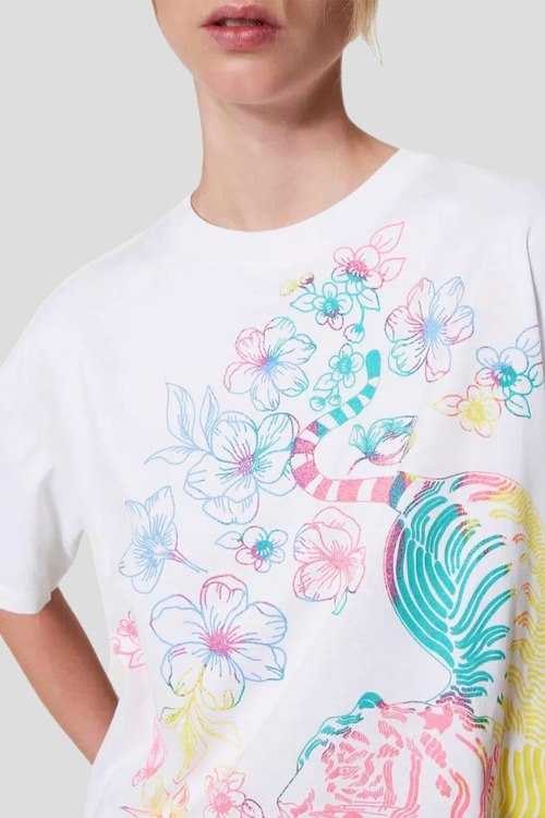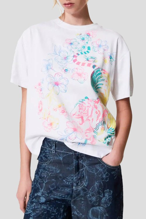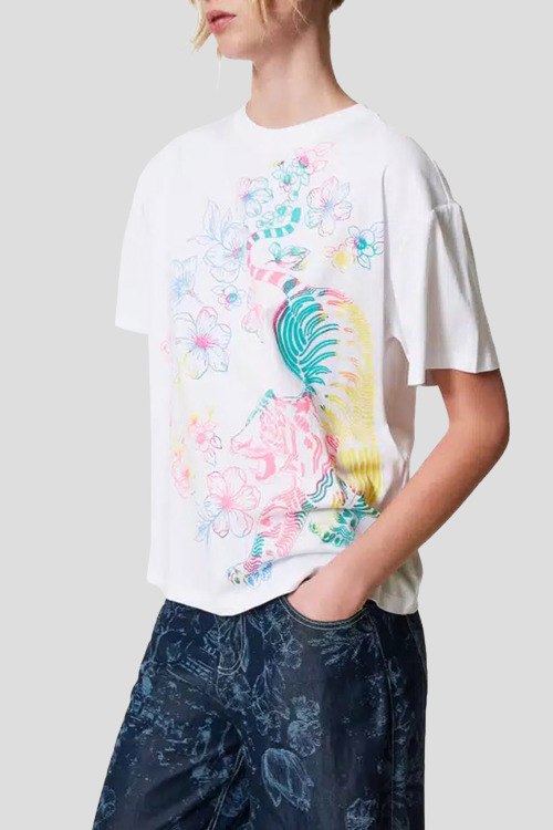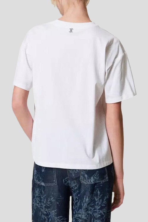 Детали: Женская белая футболка из хлопка от TWINSET (Твинсет). Классическая длина, круглый вырез горловины, короткие рукава, графический принт спереди