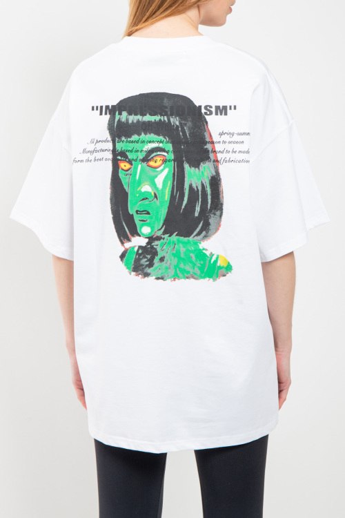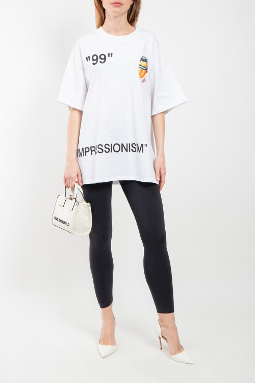 Женская белая хлопковая футболка от Off-White (Офф-Вайт). Принт спереди и сзади, круглый вырез горловины, фасон oversize, короткий рукав, удлиненная длина.