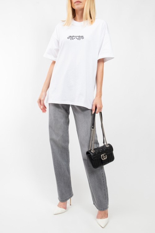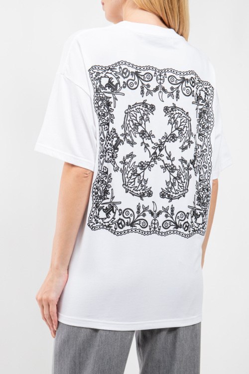 Женская белая хлопковая футболка от Off-White (Офф-Вайт). Фасон oversize, принт на груди и на спине, круглый вырез горловины, короткий рукав, удлиненная длина.