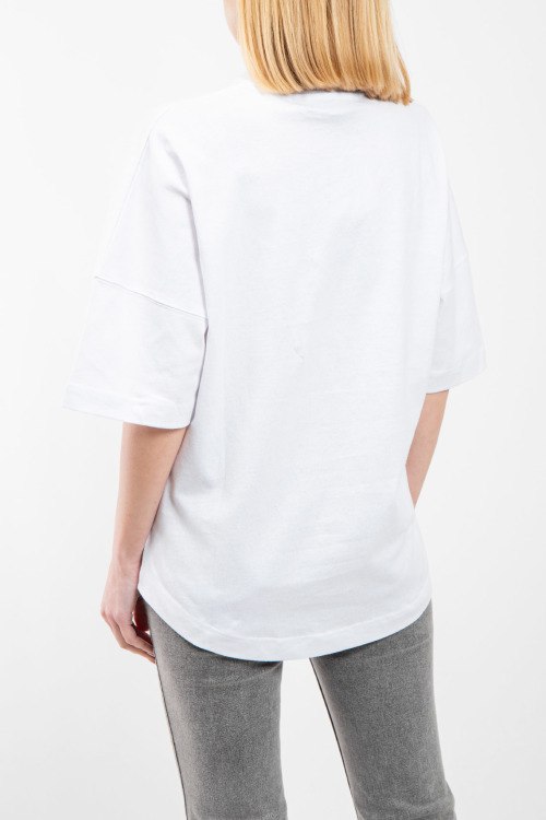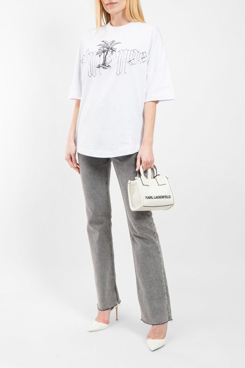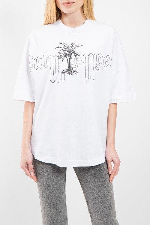 Женская белая хлопковая футболка от Palm Angels (Палм Энджелс). Принт с логотипом на груди, фасон oversize, круглый вырез горловины, короткий рукав, удлиненная длина.
