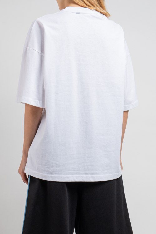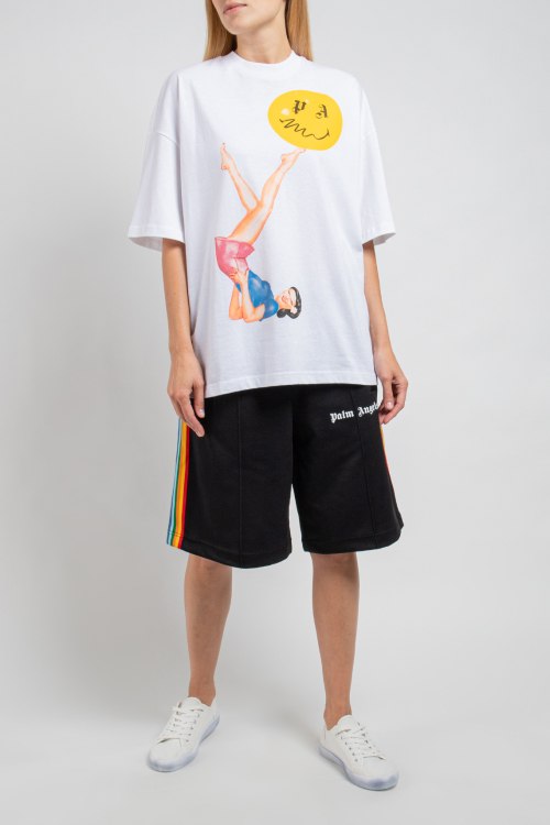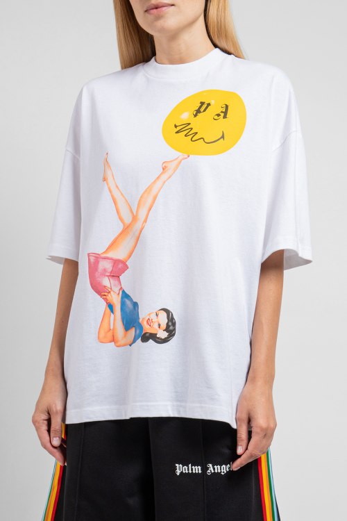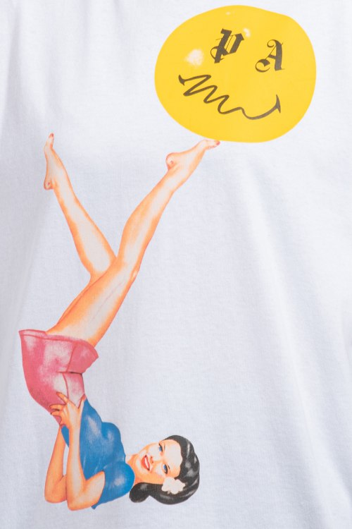 Женская белая хлопковая футболка от Palm Angels (Палм Энджелс). Графичный принт спереди, круглый вырез горловины, короткий рукав.