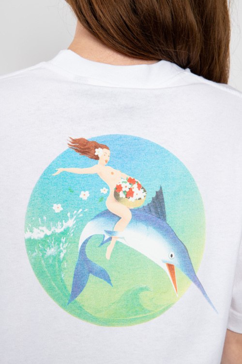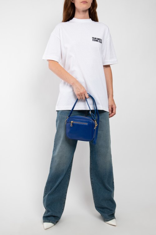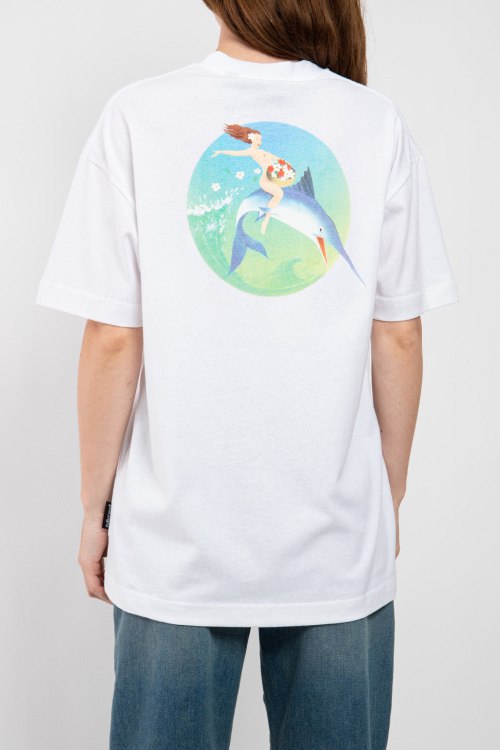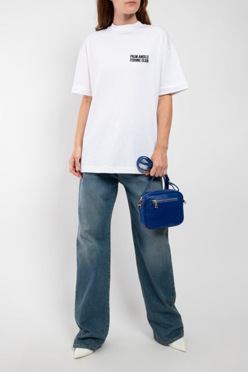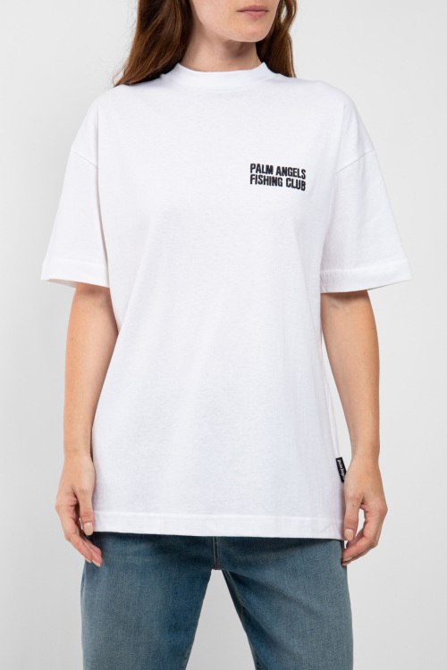 Женская белая хлопковая футболка от Palm Angels (Палм Энджелс). Фасон oversize, вышитый логотип на груди, принт на спине, круглый вырез горловины, короткий рукав, удлиненная длина