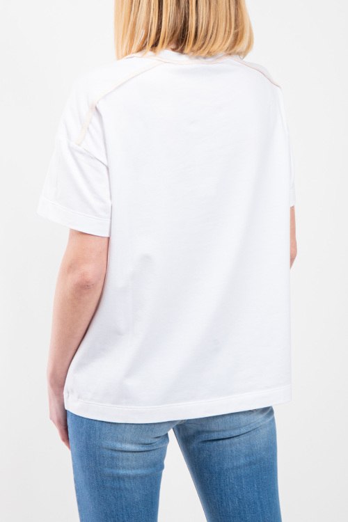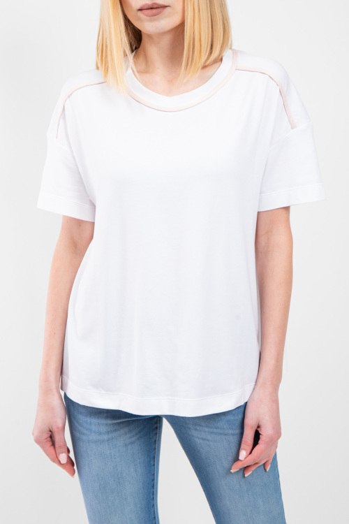 Женская белая футболка из хлопкового микса от Panicale Cashmere (Паникале Кашемир). Классическая длина, круглый вырез горловины, короткие рукава, контрастная окантовка. Замеры для размера 48: длина: 63 см, ширина по груди: 55 см, ширина по талии: 57 см, длина рукава по внутреннему шву: 8,5 см, ширина рукава: 19 см.