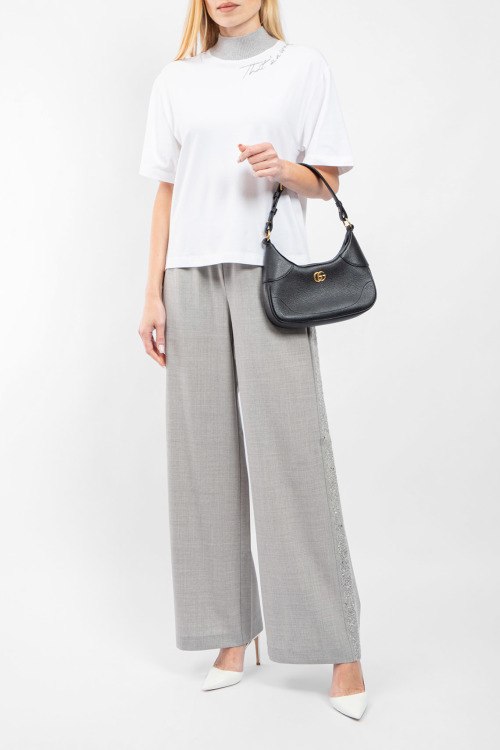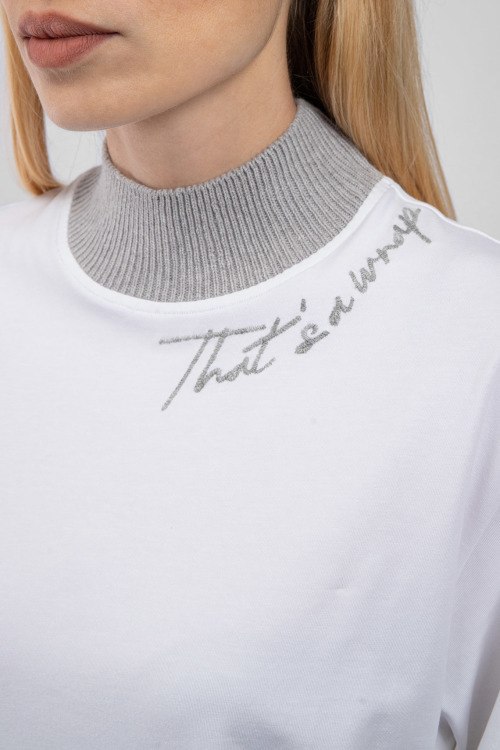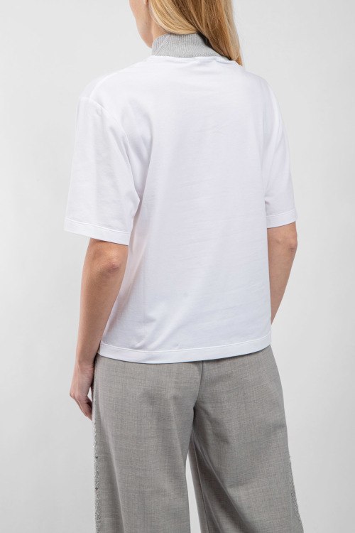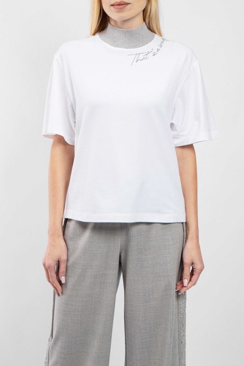 Женская белая хлопковая футболка от Panicale Cashmere (Паникале Кашемир). Трикотажный воротник-стойка, декор вышивкой, короткий рукав, классическая длина.