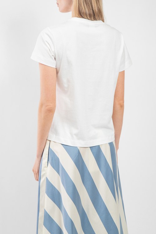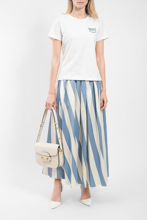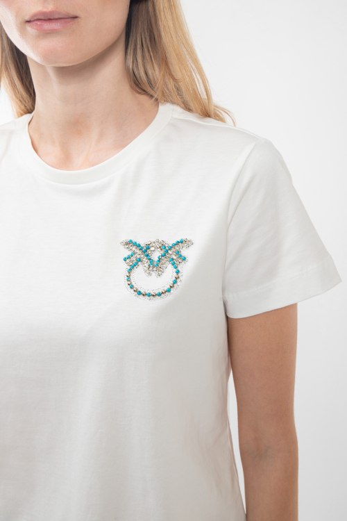 Женская белая хлопковая футболка от Pinko (Пинко). Логотип Love Birds на груди, круглый вырез горловины, короткий рукав, классическая длина.