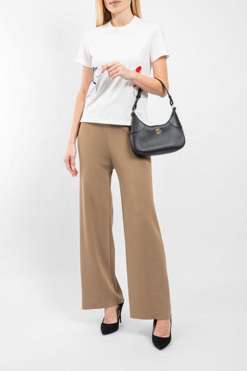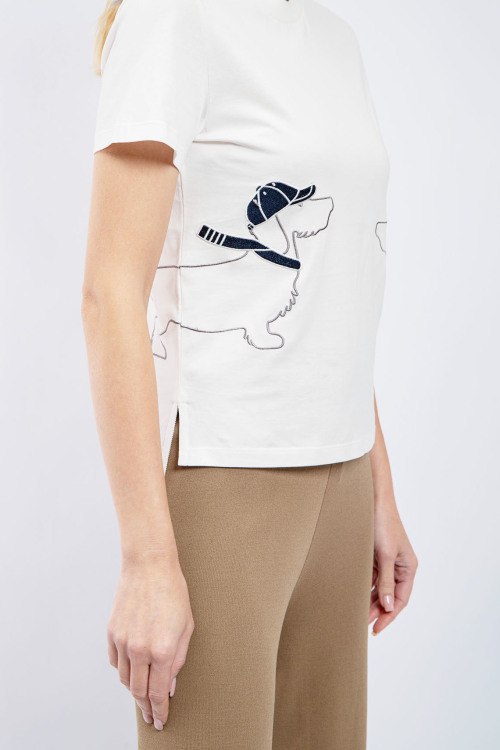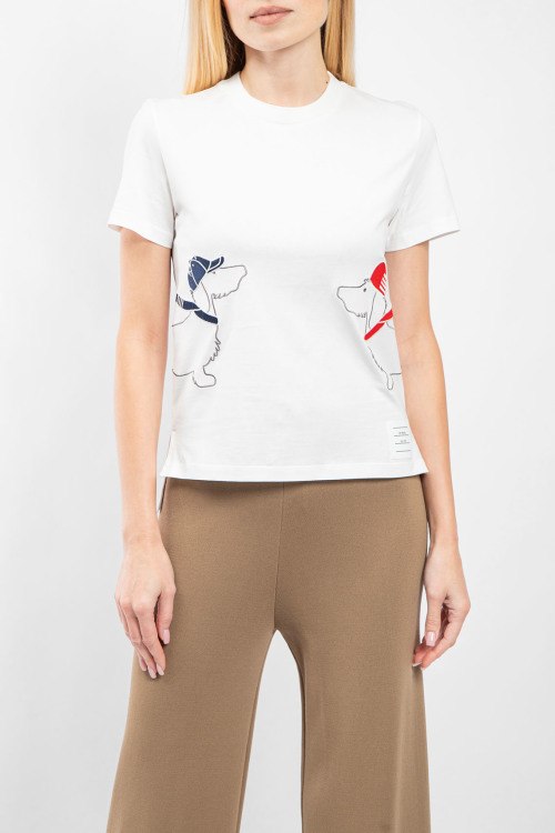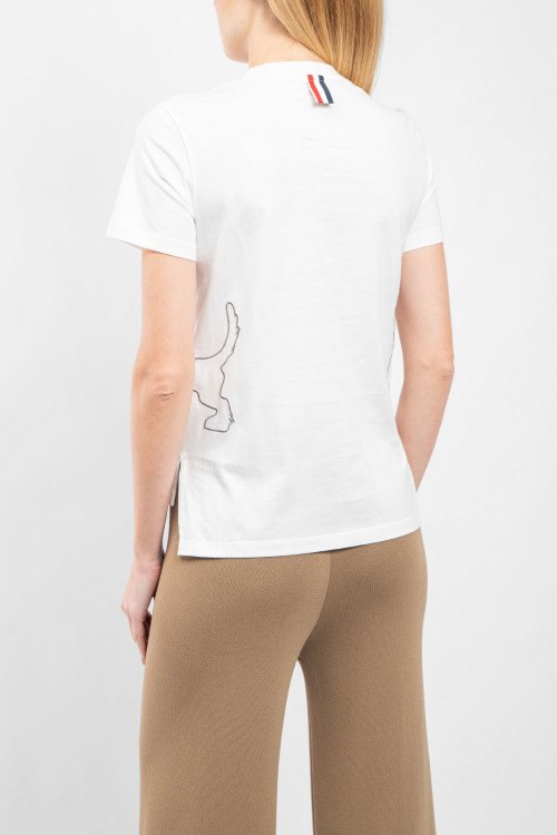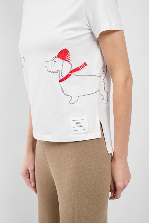 Детали: Женская белая хлопковая футболка от Thom Browne (Том Браун). Декор вышивкой, круглый вырез горловины, короткий рукав, классическая длина